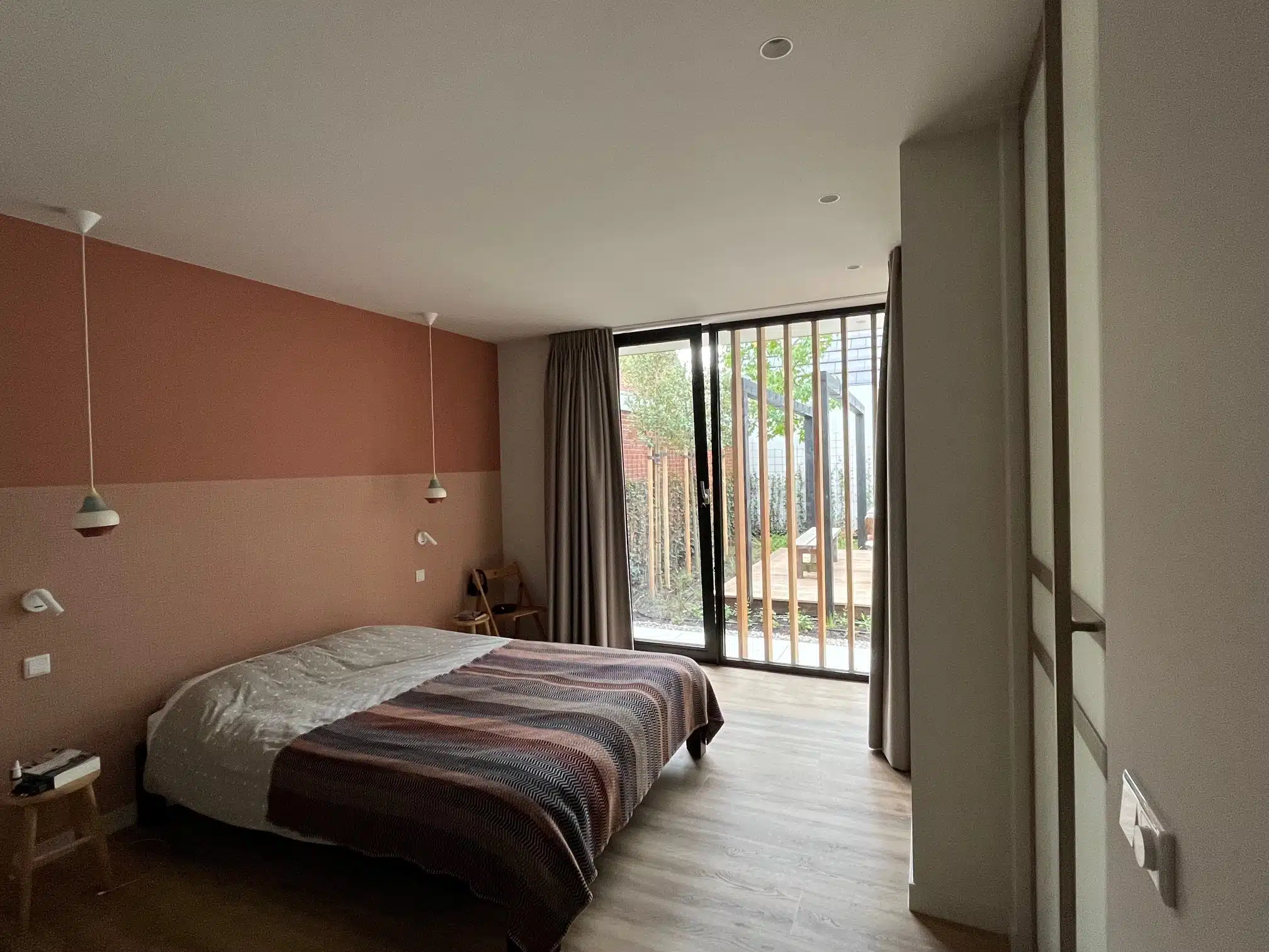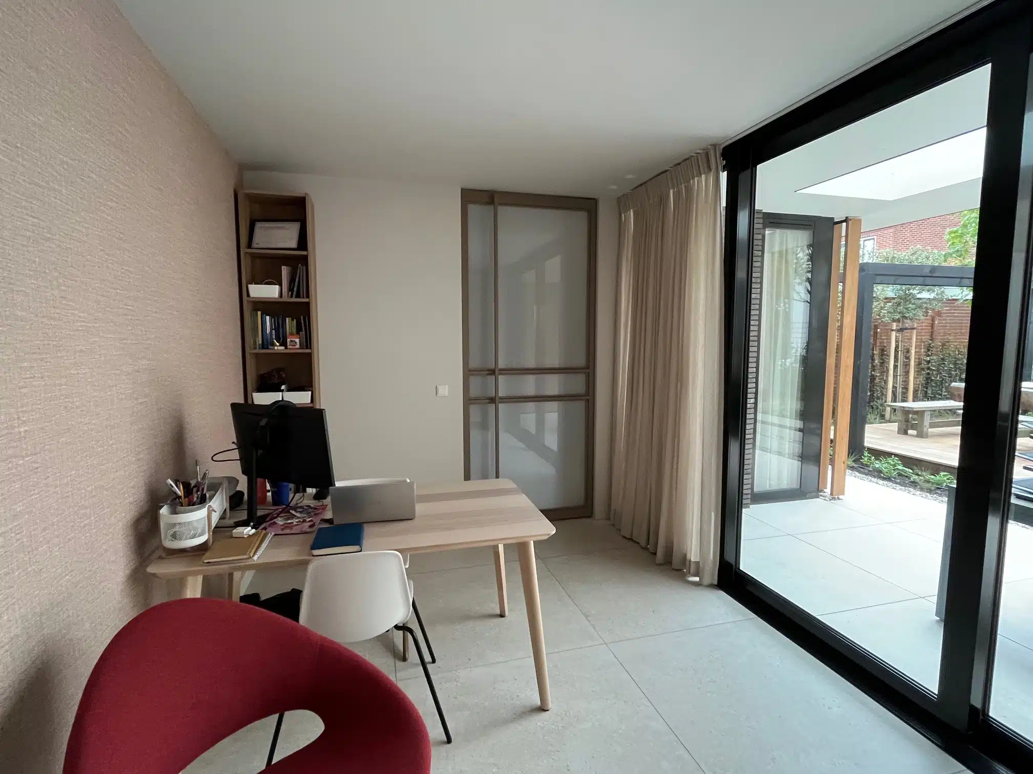 Het uiteindelijke ontwerp – met een uitbouw die plaats biedt aan een slaapkamer, badkamer en tuin- annex werkkamer – zie je hier. Herma, terwijl ze rondkijkt in de ruimte: ‘Het voelt alsof het nooit anders is geweest, de aanbouw is mooi geïntegreerd in de bestaande woning.’ Frank: ‘De jongens hebben nu boven hun eigen plek om tot rust te komen. Het naar bed gaan ‘s avonds is voor iedereen een stuk relaxter geworden. En wij hebben nu een plek om met z’n tweeën te zijn.’
