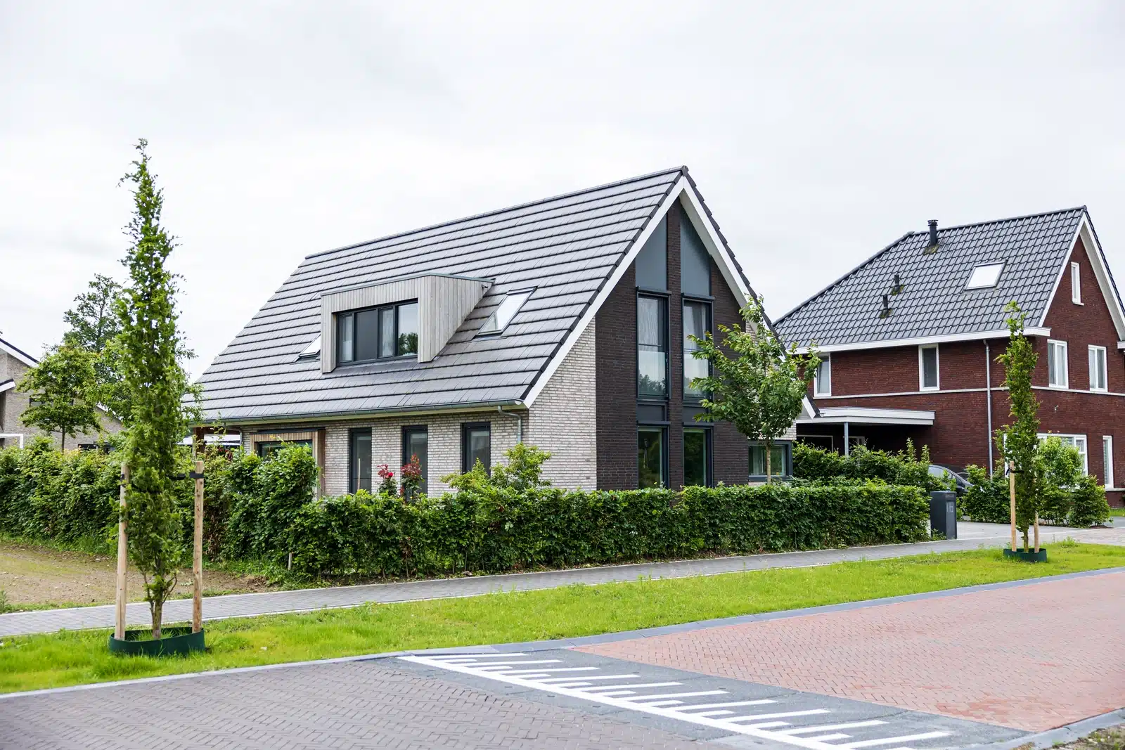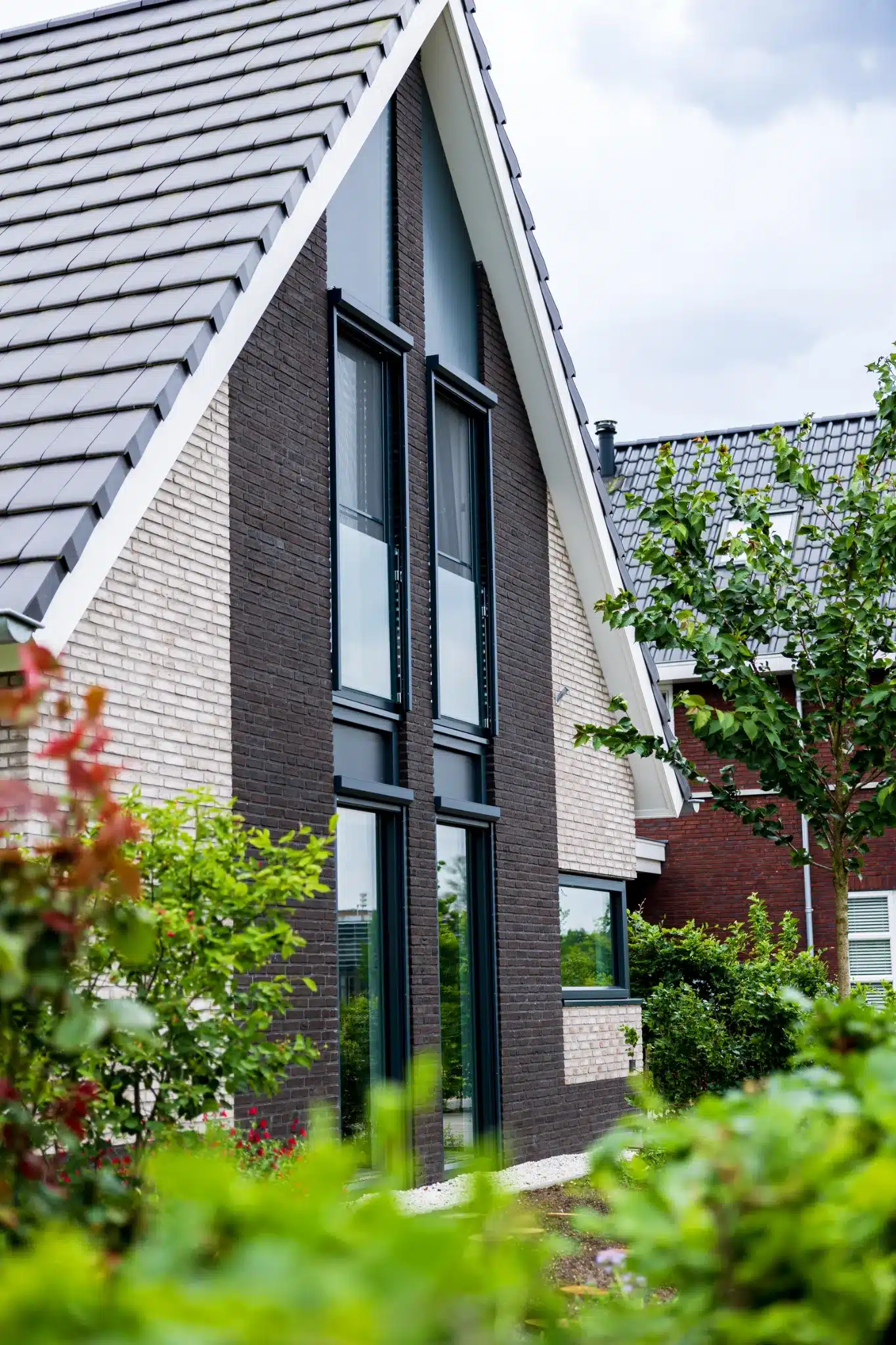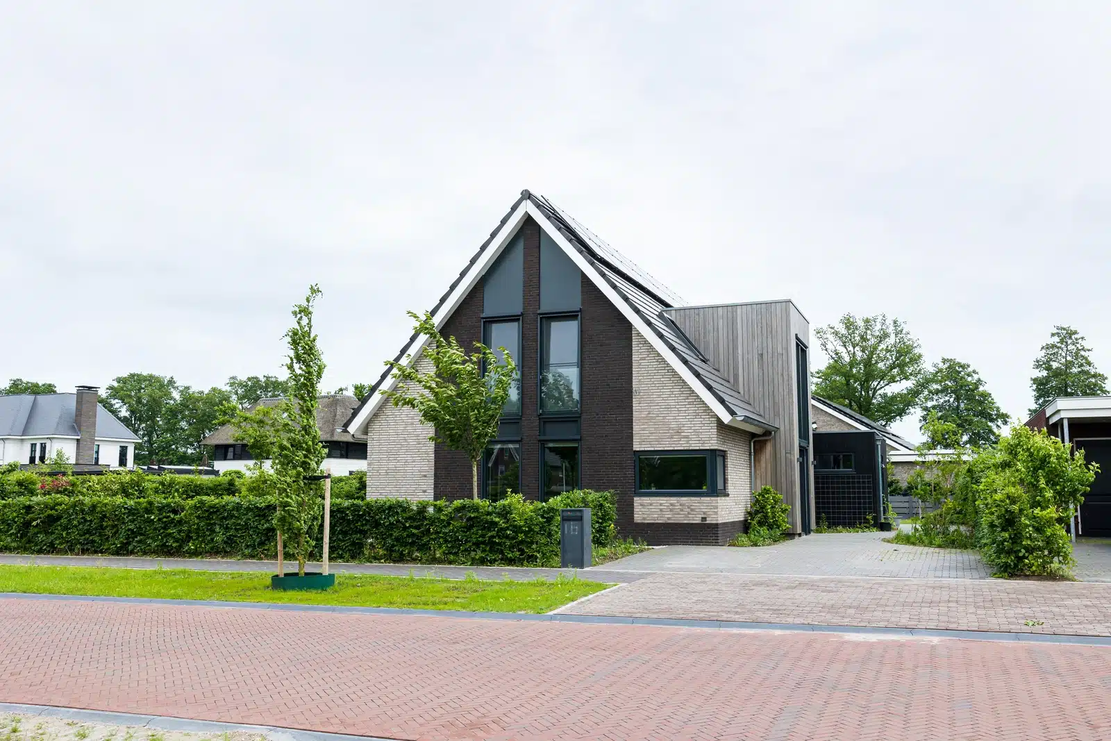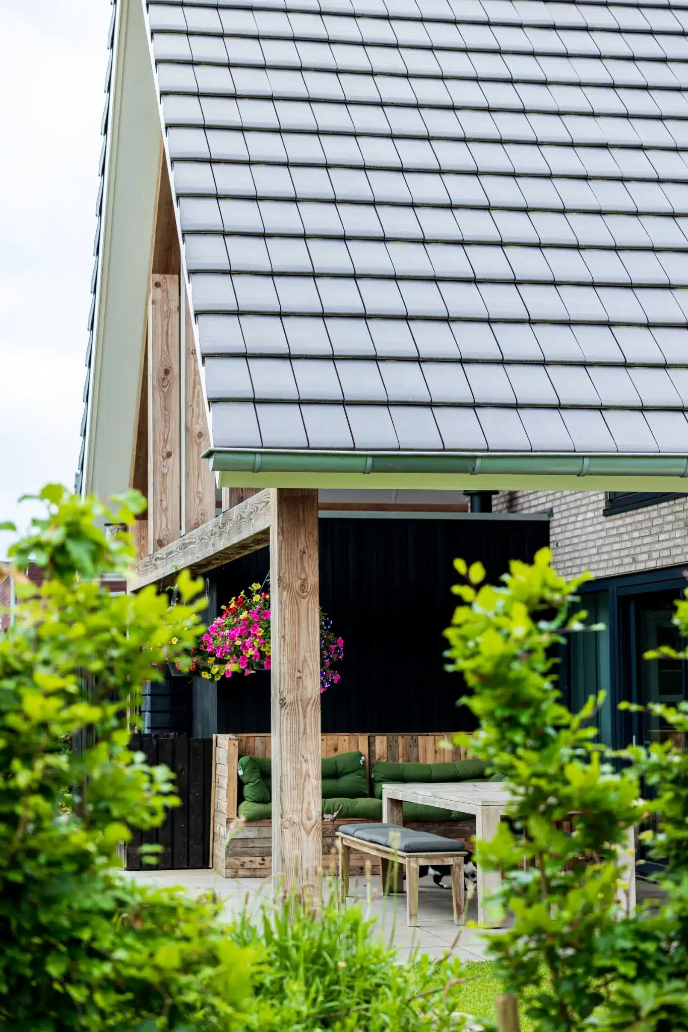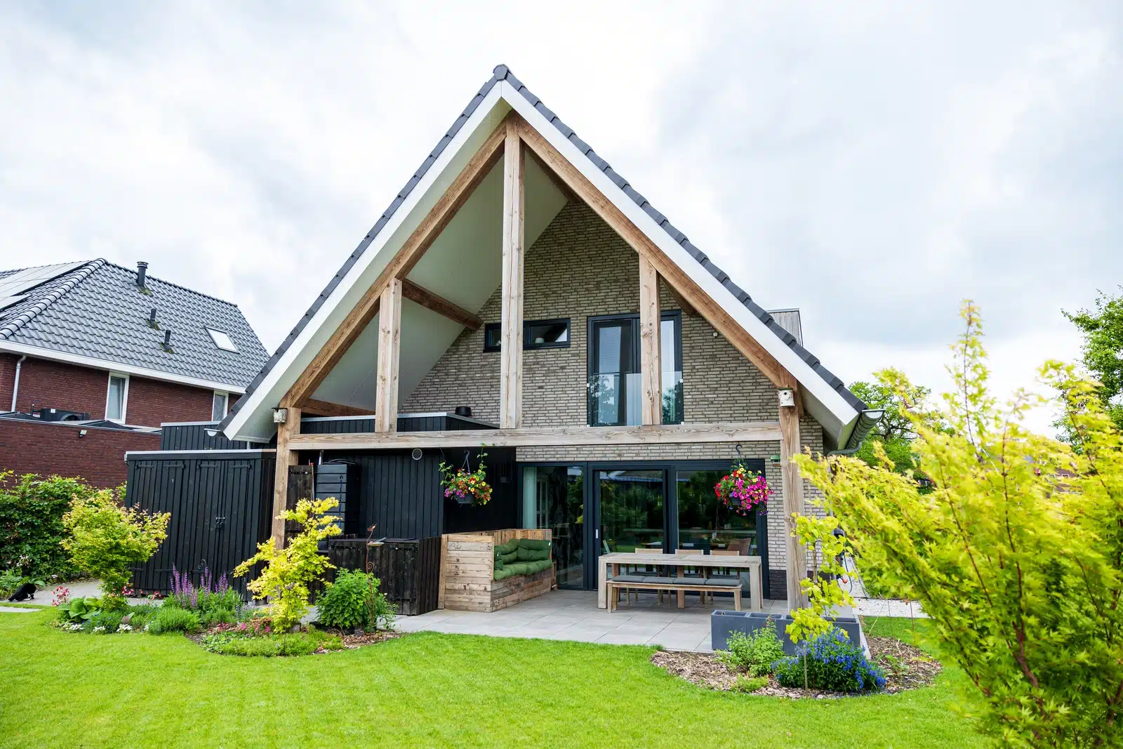 Aan de achterkant van de woning is een overdekt deel gecreëerd. Perfect om te loungen en genieten van de buitenlucht, ongeacht het weer. Dit is bereikt door het doortrekken van de kap en een houten draagconstructie, wat een natuurlijke uitstraling geeft aan de ruimte. Het ontwerp onderscheidt het hoofdvolume van het bijgebouw door gebruik te maken van verschil in kleur. Deze nieuwbouw woning in Raalte biedt niet alleen een comfortabele leefomgeving. Het is de perfecte balans tussen stijl en comfort, waar bewoners volop van kunnen genieten.