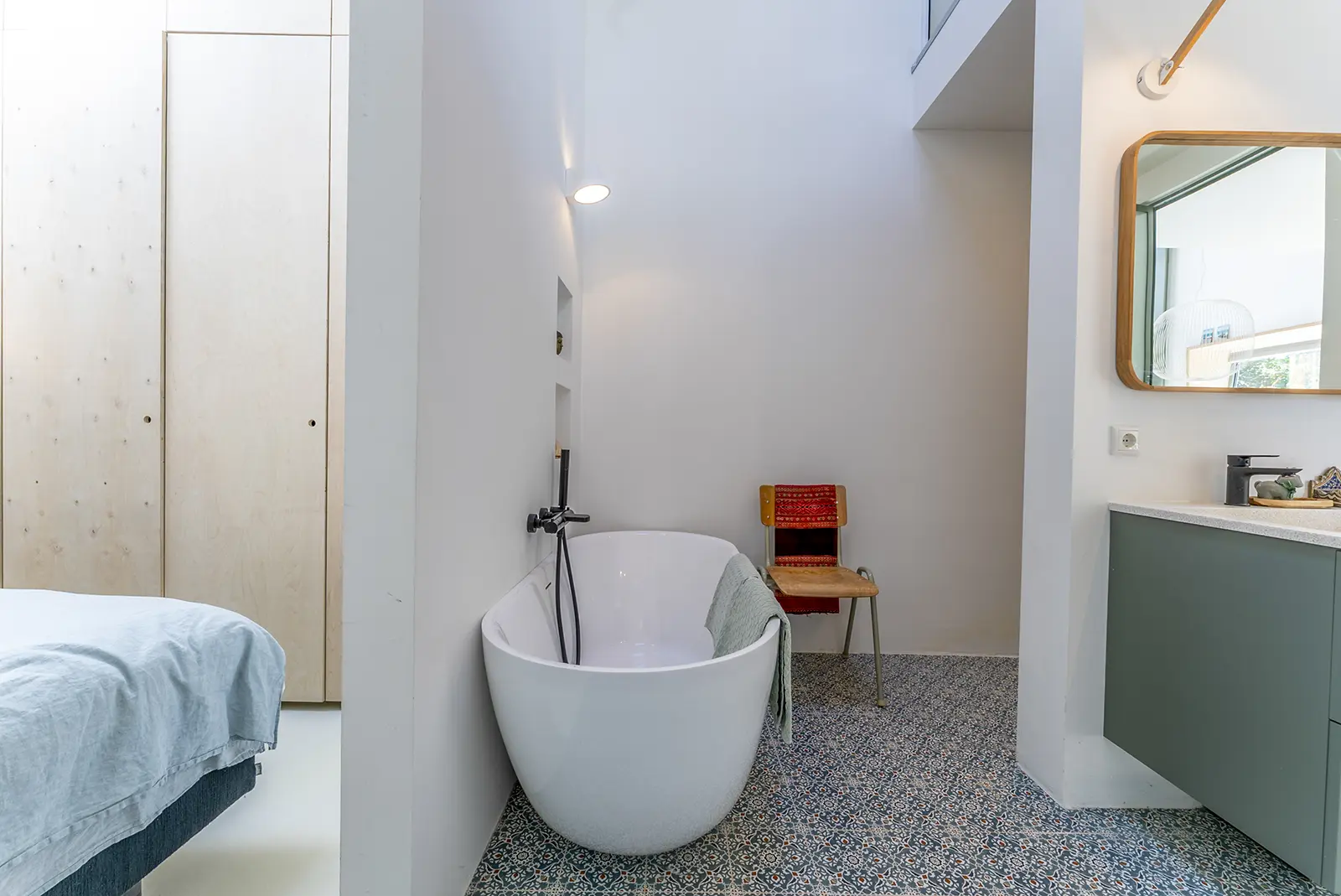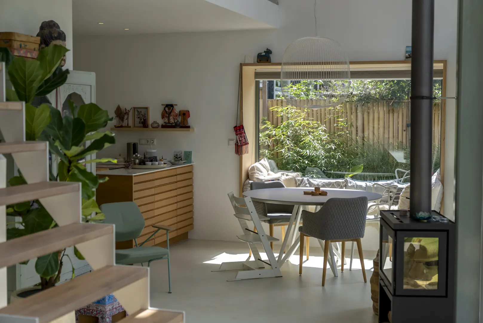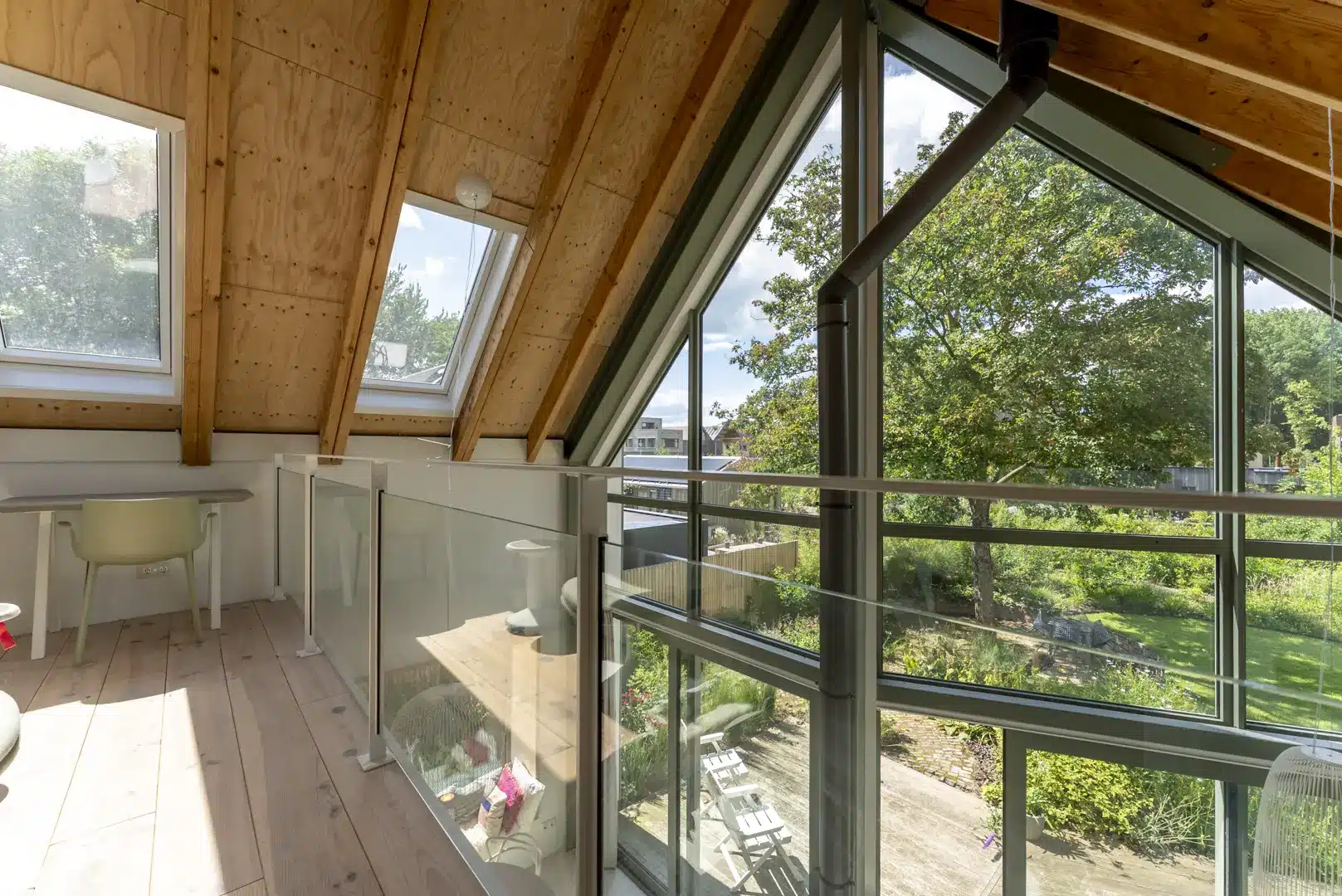 Binnen voelt het huis ruim en licht. Grote raampartijen halen het groen naar binnen en vide laat daglicht diep door de woning stromen. Op de begane grond liggen de slaapkamer en badkamer, boven is ruimte voor een logeerkamer. Compact, maar compleet.