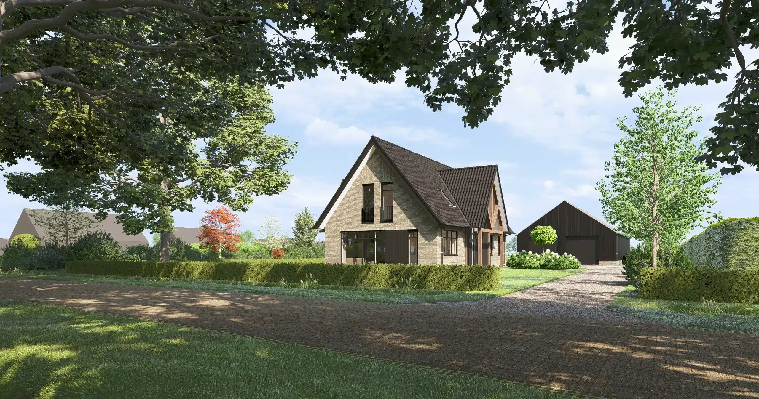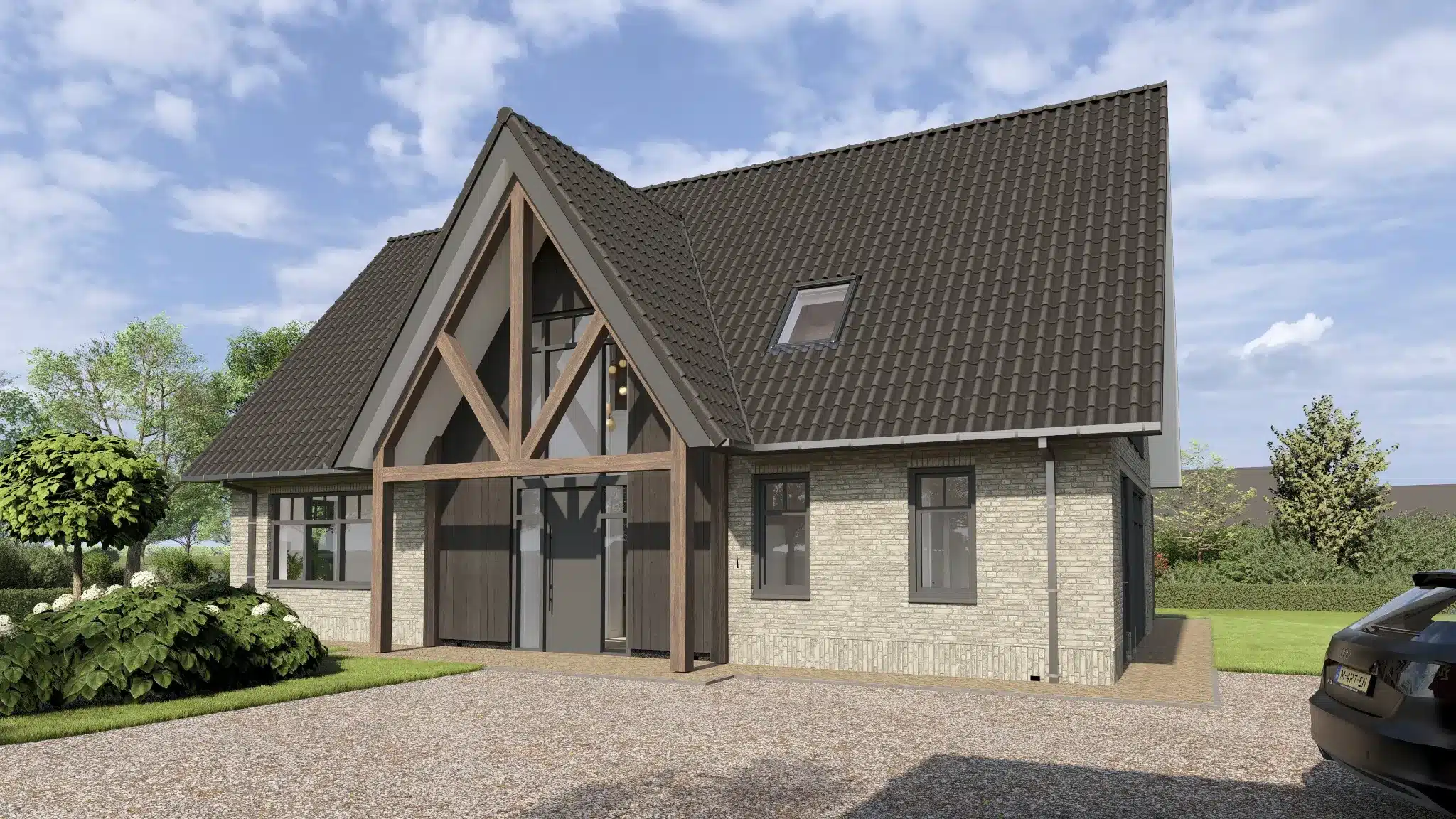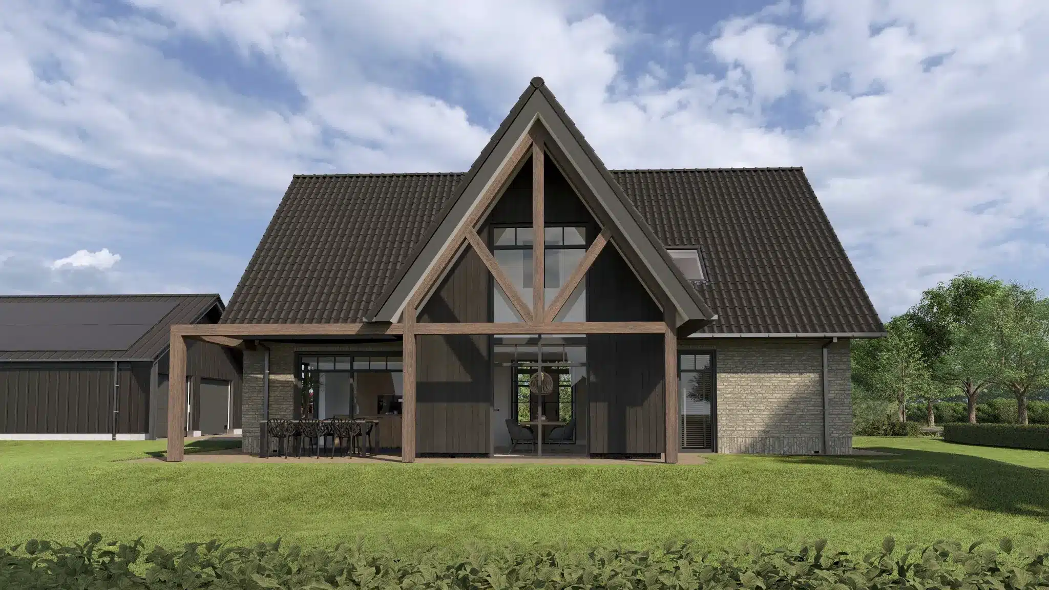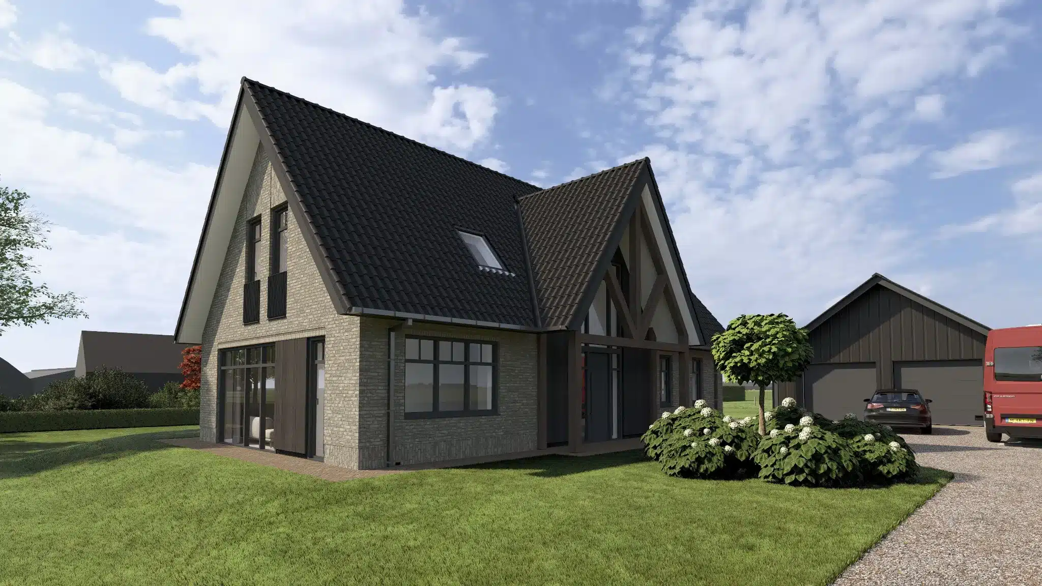 Het perceel is ruimtelijk in het landschap opgezet, waardoor het volledig uitzicht biedt. Zonder afbreuk te doen aan de privacy. Een landelijke woning met moderne tinten. Door de combinatie van hout, met liggend en staand metselwerk.