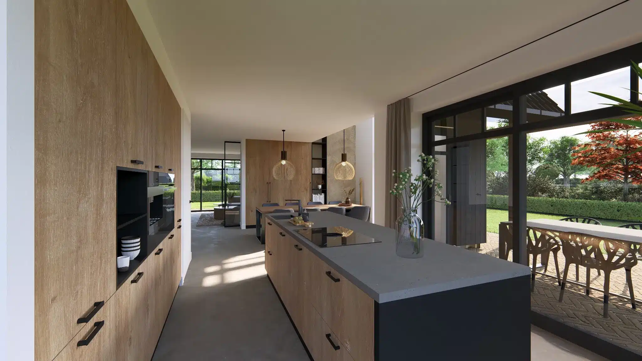 Op de bovenverdieping bevinden zich twee vides. Deze geven een ruimtelijk gevoel, en zorgen voor veel lichtinval. De open leefkeuken staat centraal in de woning. Geen zichtlijn ontbreekt. Vanuit hier pak je het uitzicht van elke zijde van de woning.