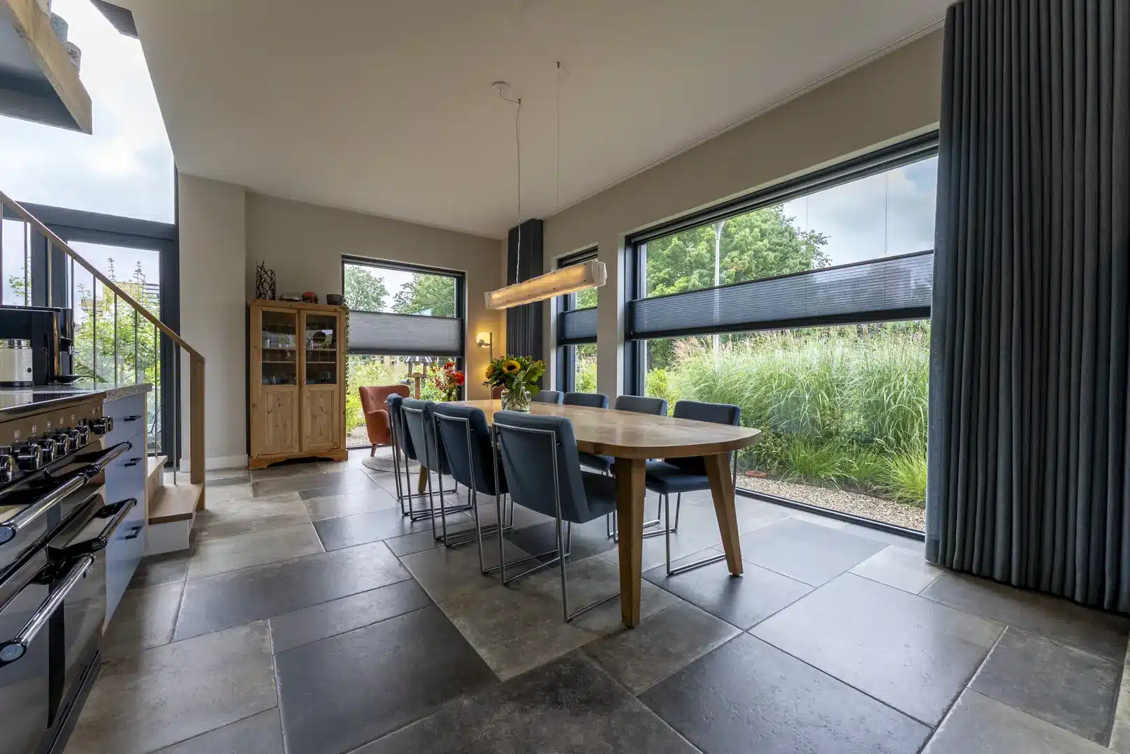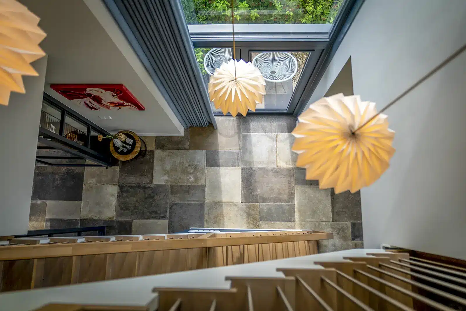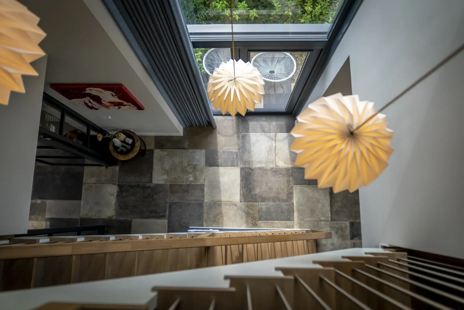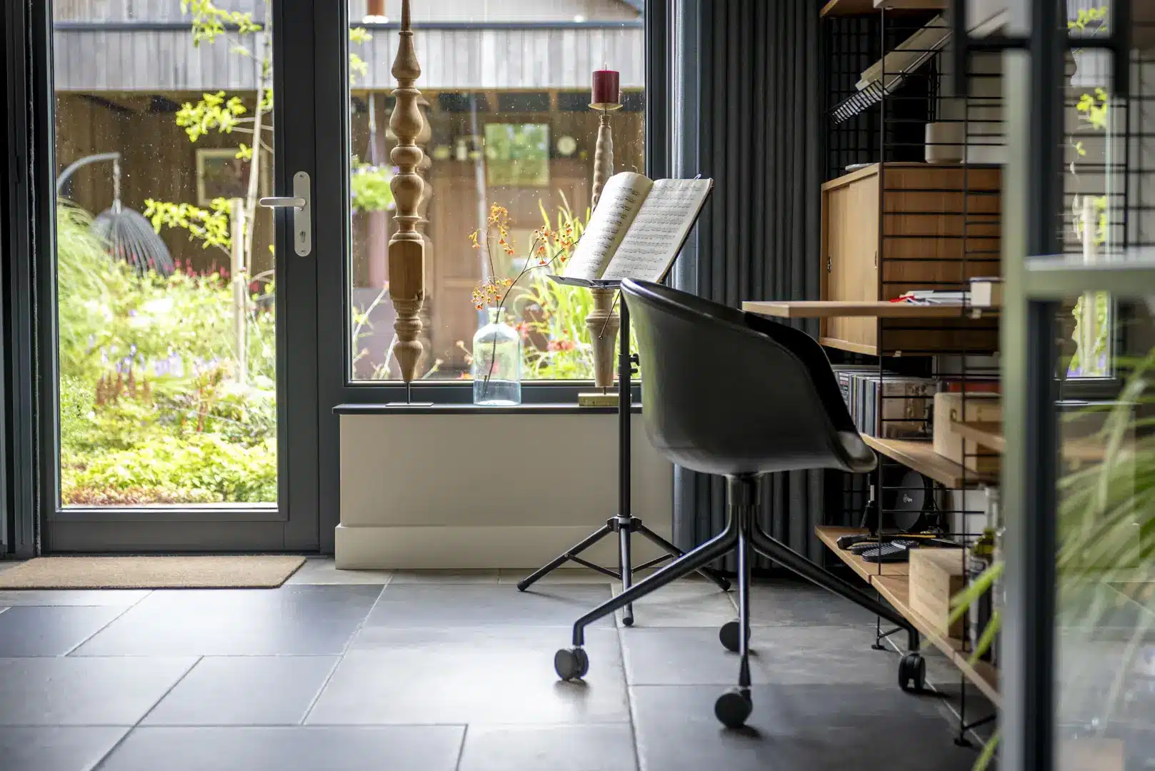 Beneden is juist alles open. De begane grond vormt het hart van het huis: een open ruimte waar alles samenkomt. Keuken, woonkamer én een muziekkamer om samen te spelen en te oefenen met de muziekgroep. Want muziek speelt een grote rol in dit gezin.