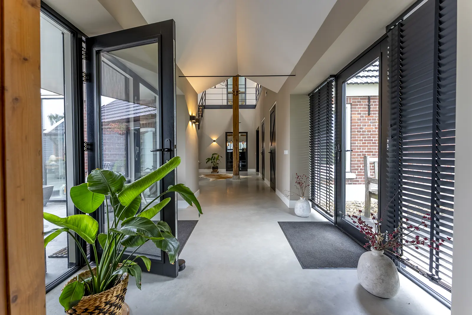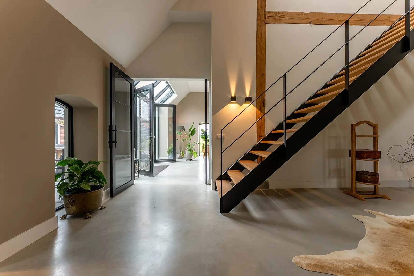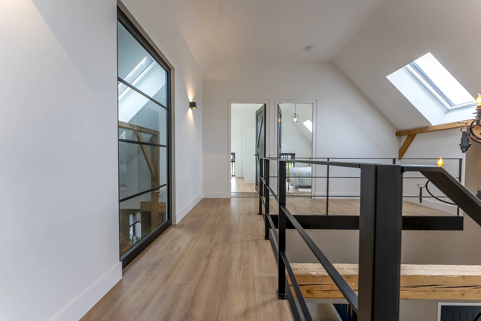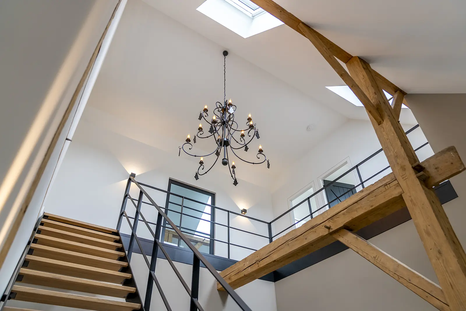Bij binnenkomst trekt de vide direct de aandacht. Het daklicht trekt de blik omhoog, waar dakramen het daglicht naar binnen brengen. De oorspronkelijke houten gebinten zijn behouden en geven warmte en karakter aan het moderne interieur. De keuken aan de voorzijde, de woonkamer aan de achterzijde. Door het glas in de oude staldeuren en de openingen in de gevel stroomt het landschap letterlijk naar binnen.