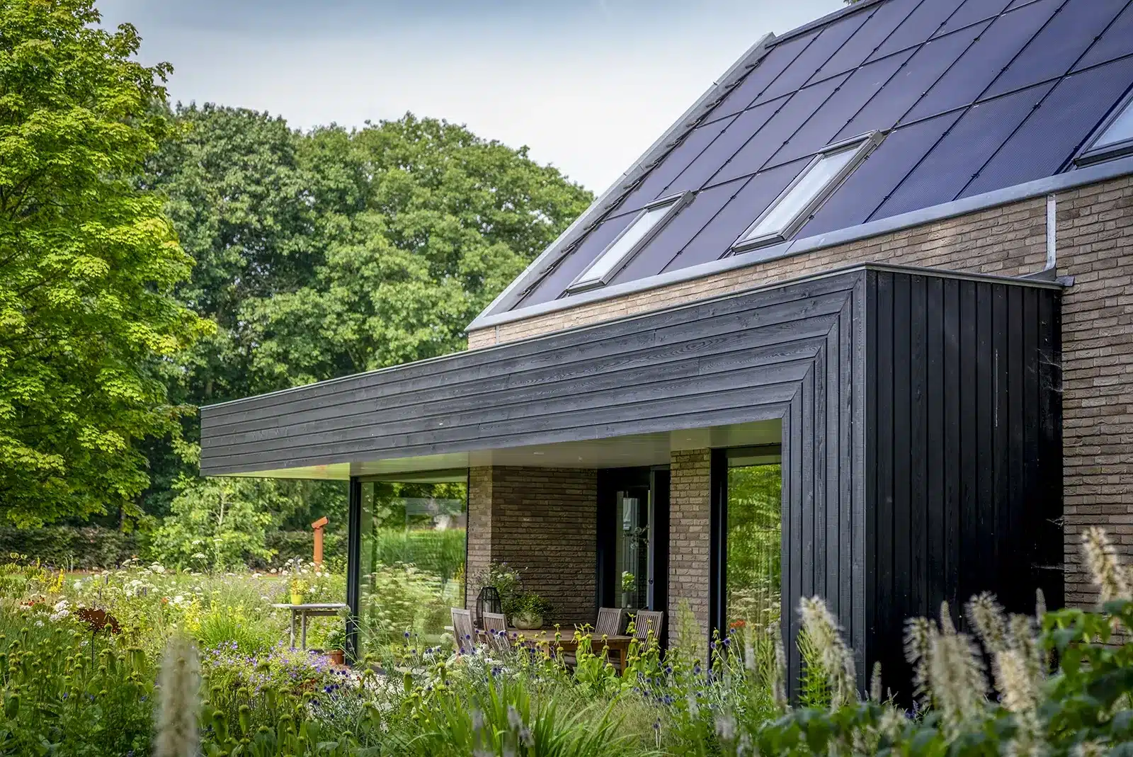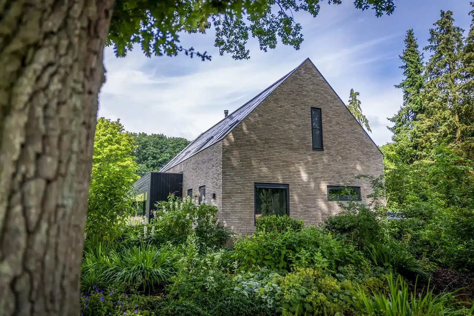 Aan de zuidzijde zorgen royale overstekken voor een fijne balans tussen licht en schaduw. In de zomer werken ze als natuurlijke zonwering en in de winter valt het licht juist diep naar binnen. Ook de lage ochtendzon is onderdeel van het ontwerp: lamellen in de overstekken zorgen voor een zachte lichtinval in de vroege uren. Het uitzicht blijft vrij en het binnenklimaat prettig, het hele jaar door.