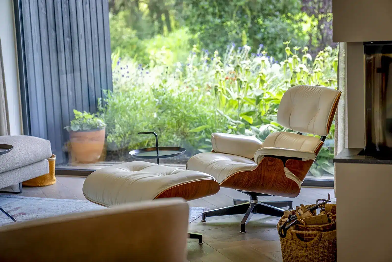 De indeling sluit aan op de kwaliteiten van de omgeving: functionele ruimtes liggen aan de noordkant, terwijl de leefruimtes zich richten op het zuiden en westen. Zo ontstaat een natuurlijke verbinding tussen binnen en buiten, waarin het landschap elk seizoen deel uitmaakt van het wonen. Het grote raam in de woonkamer omlijst het uitzicht en versterkt dat gevoel, met elk seizoen een andere sfeer.